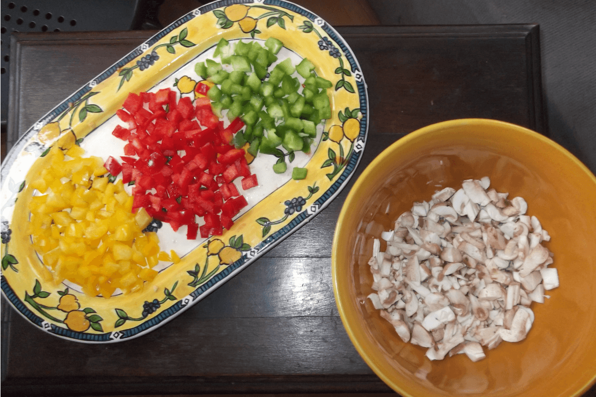 2. Mientras tanto, lavamos los pimentones y los picamos en cubitos. Podemos ayudarnos con una tijera de cocina. Picamos también los champiñones en trozos pequeños.