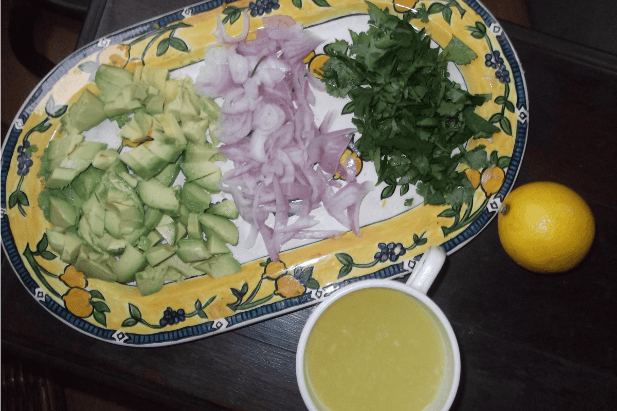 3. Picamos la palta, la cebolla la cortamos estilo pluma. Lavamos y cortamos el cilantro con las tijeras. Exprimimos los limones hasta obtener la cantidad deseada. Si notas que la cebolla está demasiado fuerte, lávala en un colador con agua bien caliente durante algunos segundos, o bien déjala remojando en agua caliente (no hirviendo) con un chorrito de jugo de limón y una pizca de azúcar. Luego enjuaga.
