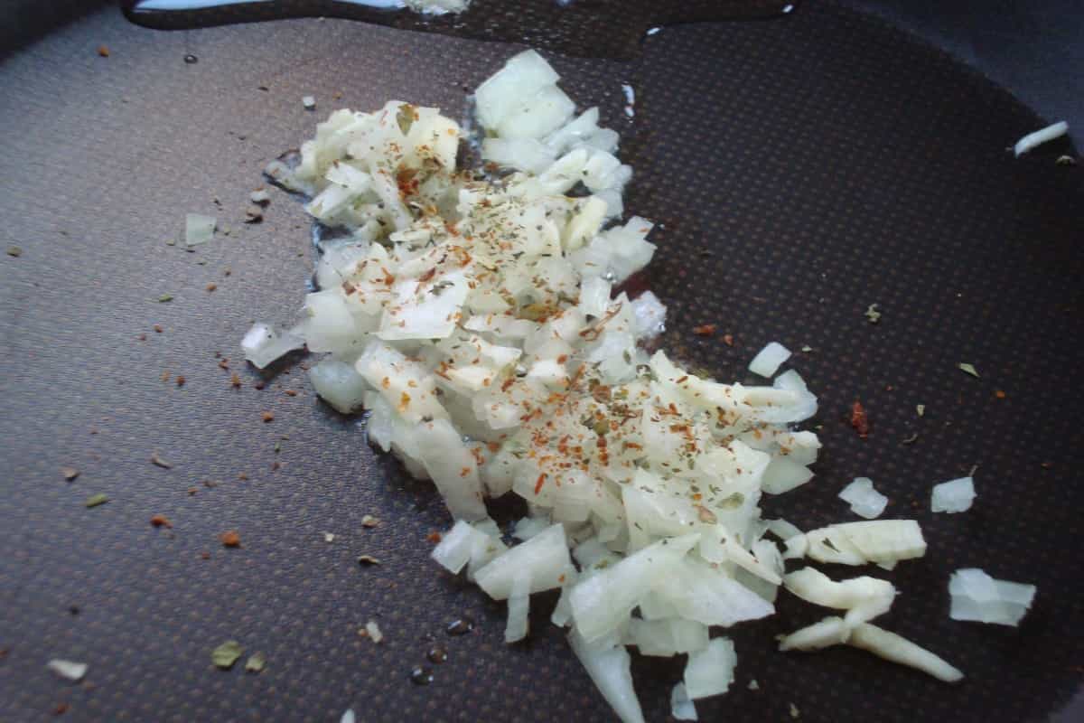 En un sartén con 1 cucharada de aceite de oliva caliente, saltear por 1 minuto la cebolla picada en cuadrados pequeños. Añadir los ajos y sazonar con sal y merquén a gusto. Reservar.