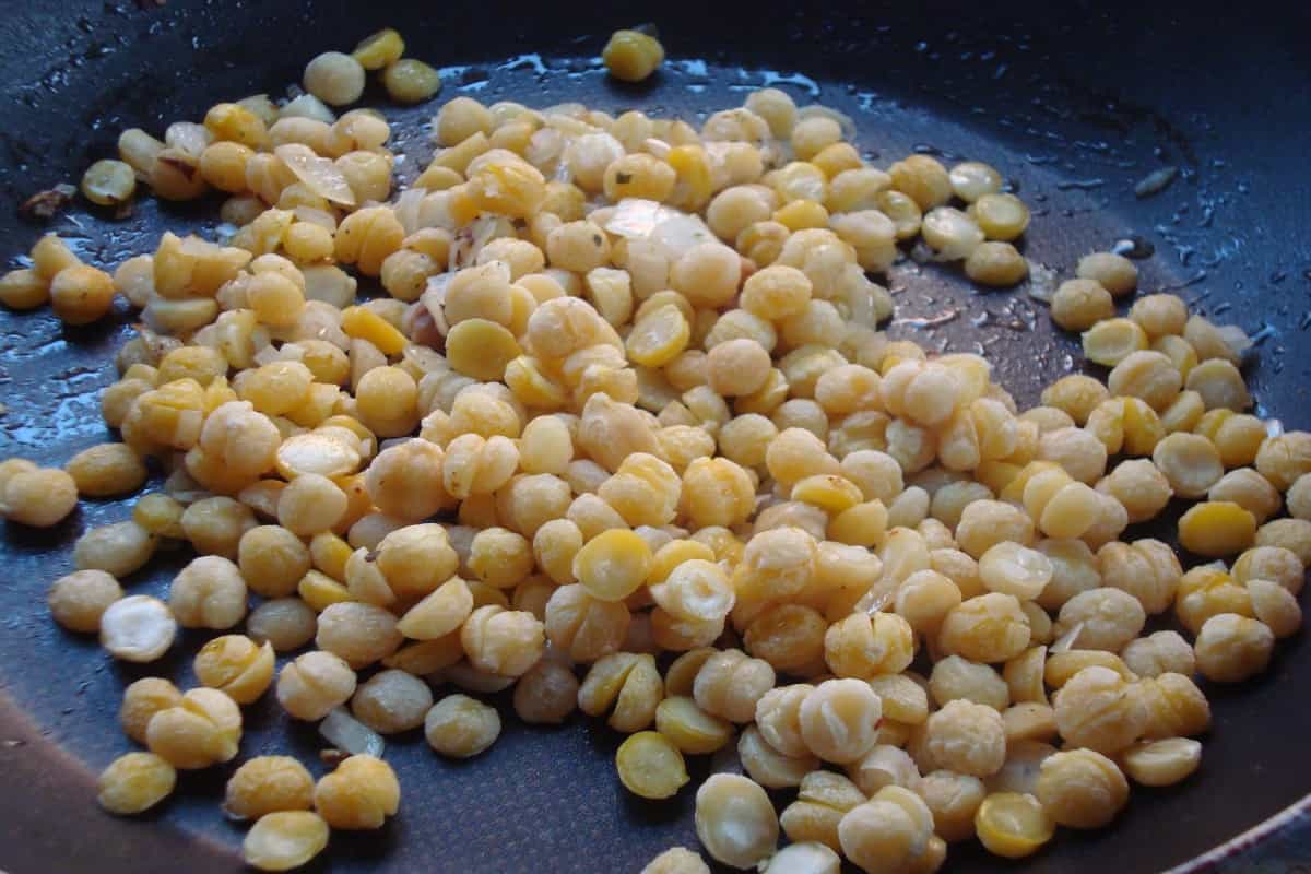 Cuando los garbanzos estén cocidos y blandos, escurrirlos (reservar el liquido de la cocción). Luego, añadir el sofrito de cebolla y ajo.