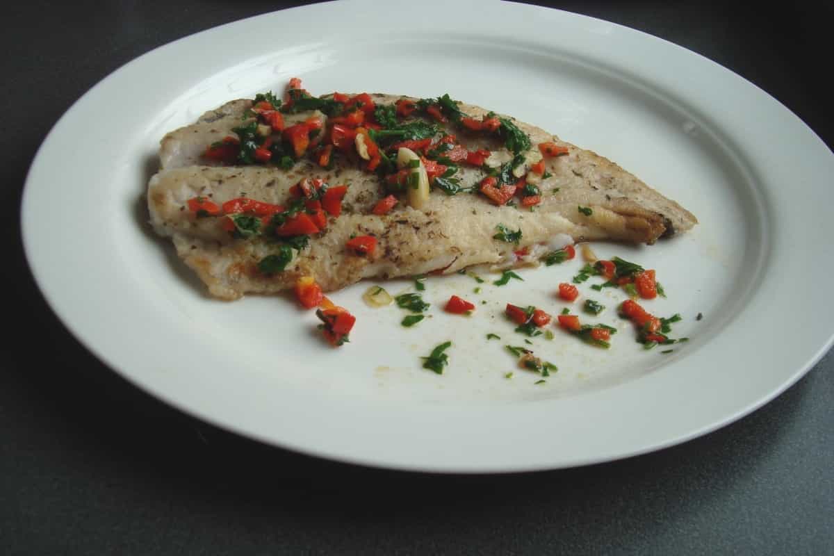Servir los filetes de merluza sobre una base de pimentones y espolvorear con perejil fresco picado.