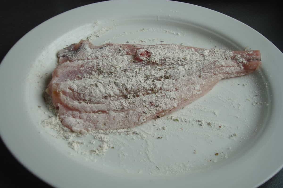 En un plato plano mezclar harina, orégano y sal a gusto. En un pocillo batir los huevos.