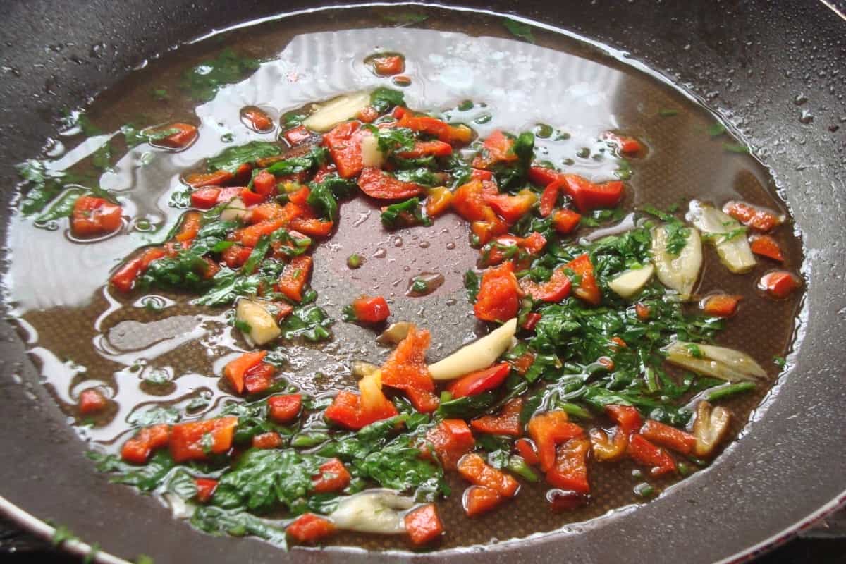 En un sartén con 2 cucharadas de aceite de oliva caliente, dorar los ajos laminados. Incorporar el pimentón sin pepas y picado, cocinando a fuego suave por 10 minutos. Añadir el perejil fresco, el jugo de limón y el ají. Revolver suavemente y sazonar a gusto