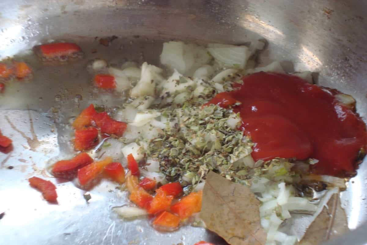 En una olla con 2 cucharadas de aceite caliente, sofreír la cebolla picada en cubos pequeños y el ajo machacado. Cuando la cebolla esté dorada, incorporar el tomate pelado y molido, orégano, pimentón picado y laurel.