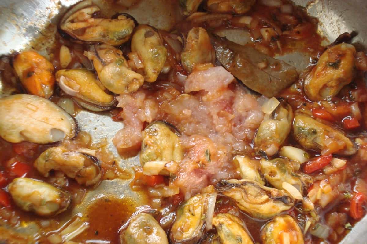 Revolver y cocinar a fuego medio por 5 minutos, agregar el vino blanco, seguir la cocción por 5 minutos y añadir los mariscos.
