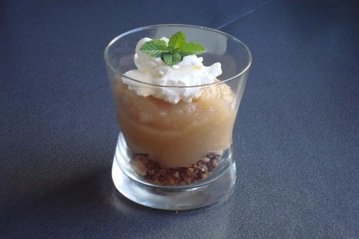 Para armar el postre danés de manzana: en un vaso disponer una capa de migas, luego una porción del puré de manzanas y finalmente la crema batida.