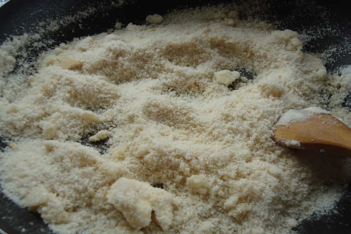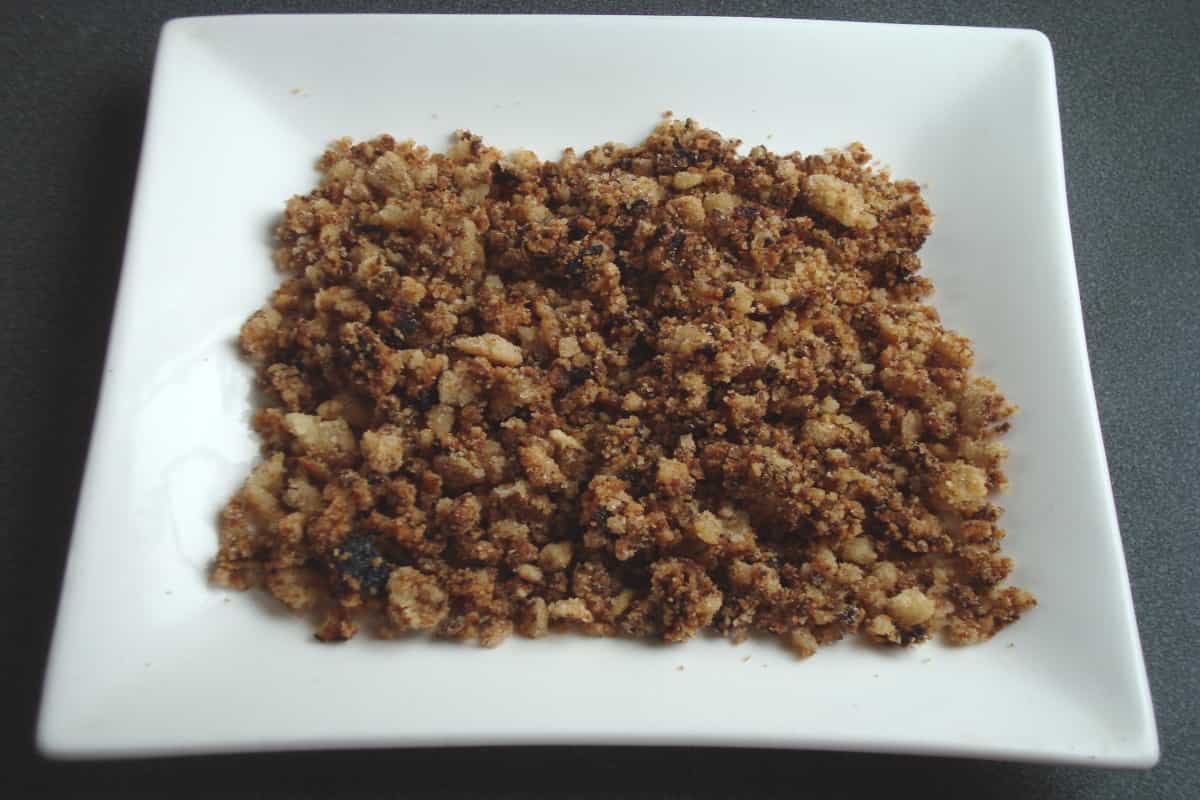 En un sartén caliente con la mantequilla derretida, agregar 4 cucharadas de azúcar y el pan rallado. Cocinar a fuego bajo hasta que las migas de pan se caramelicen y se doren un poco.
