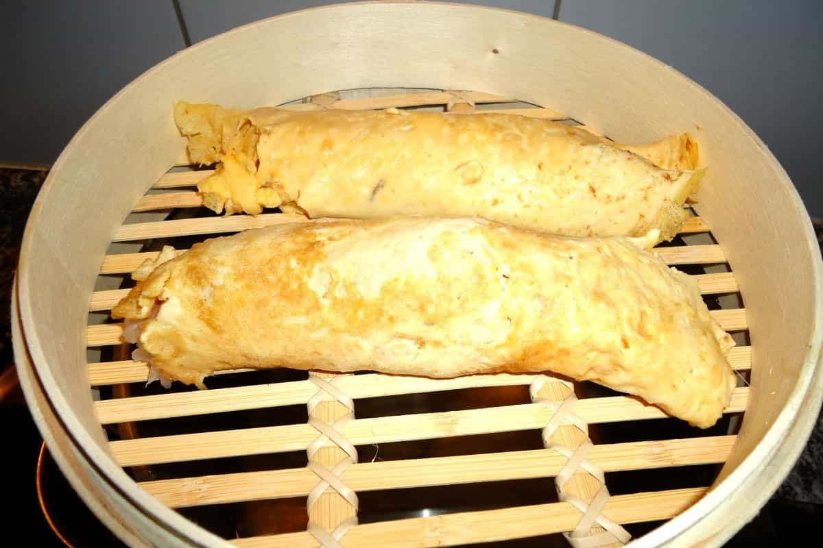 Para finalizar este delicioso plato, vierte salsa de soya sobre los arrollados y luego los cebollines salteados.