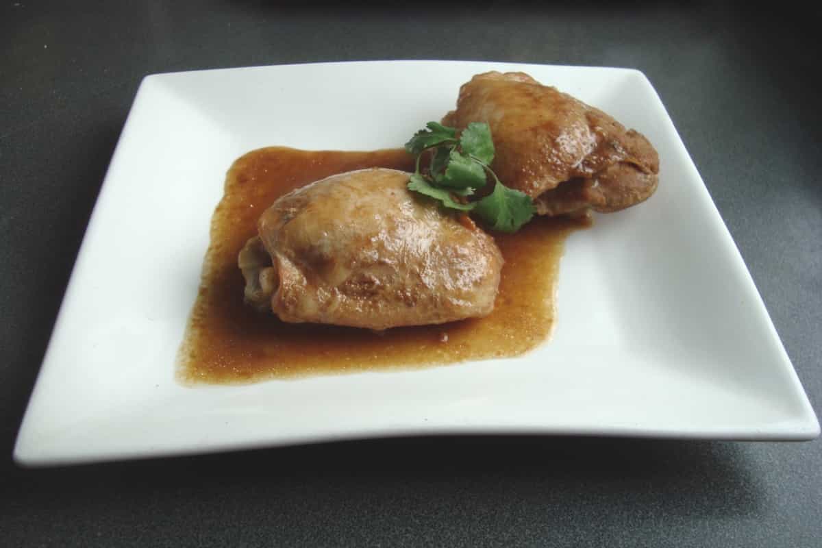 Retirar el pollo y en el mismo sartén, agregar el otro ajo picado, el resto de la soya y del jengibre y ½ taza de caldo o agua. Cocinar hasta que hierva. Agregar nuevamente el pollo, rectificar la sazón y cocinar por 20 minutos. Apagar y servir.