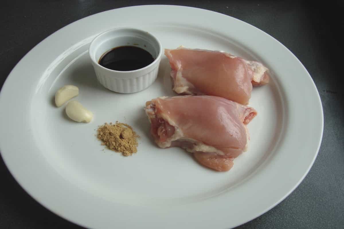 Sazonar las presas de pollo con 1 ajo picado, la mitad del jengibre y la mitad de la soya. Dejar marinar en el refrigerador por 30 minutos.