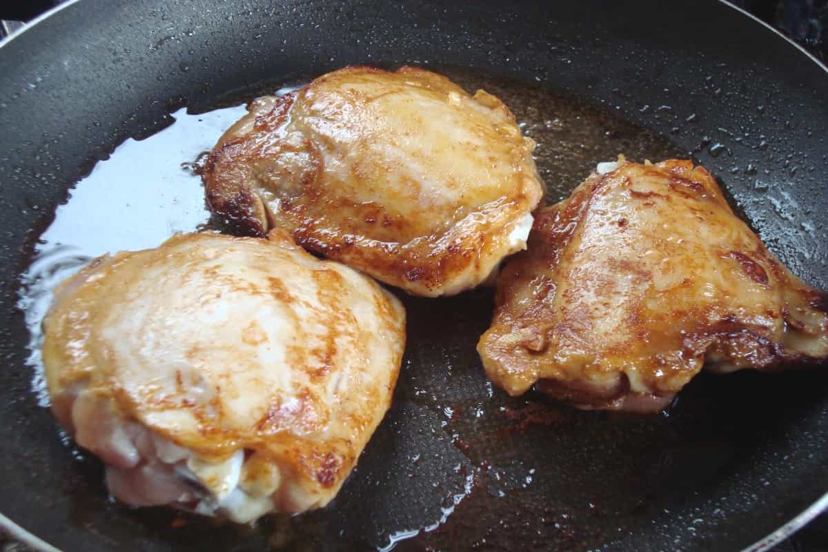 Transcurrido el tiempo del marinado, sellar las presas de pollo en un sartén con 3 cucharadas de aceite caliente. Deben quedar doradas por ambos lados.
