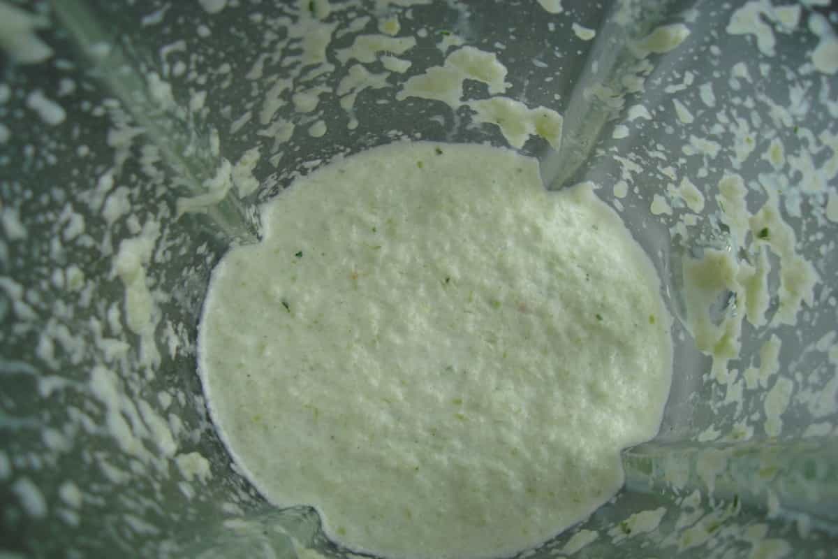 En la juguera colocar leche, un diente de ajo pelado, la mitad del jugo de limón y una pizca de sal. Mezclar hasta que los ajos se integren bien.