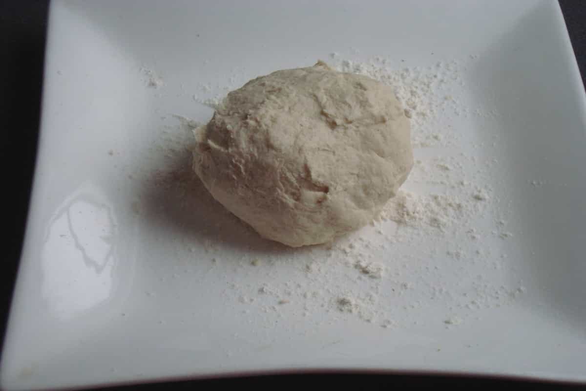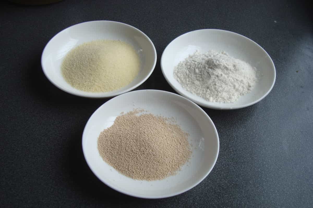 En un recipiente mezclar sémola, harina, sal y levadura. Incorporar poco a poco 250 mililitros de agua tibia e ir uniendo los ingredientes hasta formar una masa suave y homogénea.