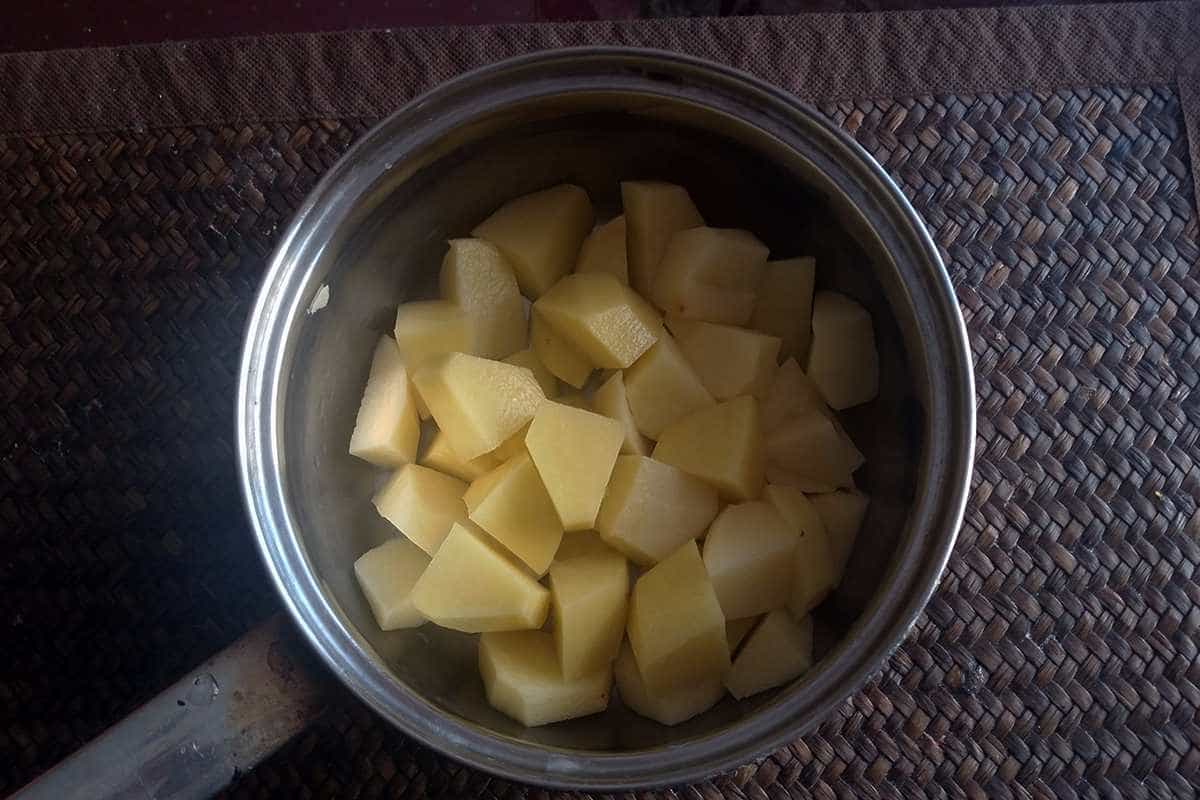 Lo primero que haremos será pelar y lavar las papas. Una vez que estén bien limpias, las cortamos en pequeños cuadrados y las ponemos a cocer en agua fría por 10 minutos a fuego alto. Ni más ni menos tiempo.