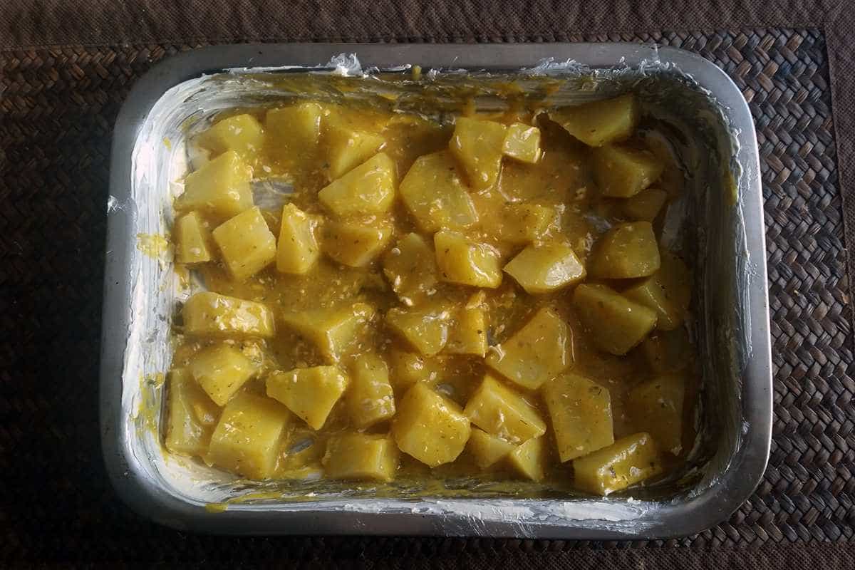 Mientras dejamos que las papas se enfríen por 10 minutos, ponemos margarina sobre la superficie de una fuente resistente al horno. Luego agregamos las papas y en la misma fuente, la salsa de mostaza. Aquí revolvemos bien y finalmente agregamos por encima el resto del jugo de limón.
