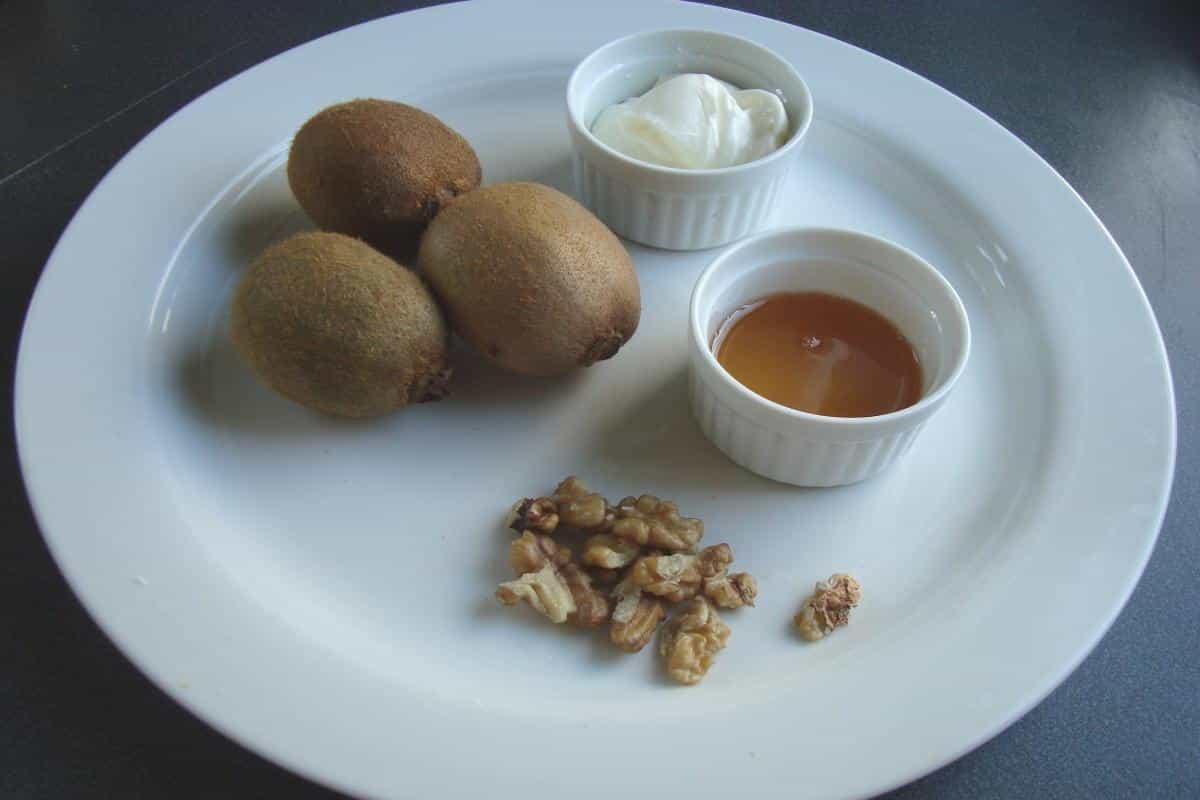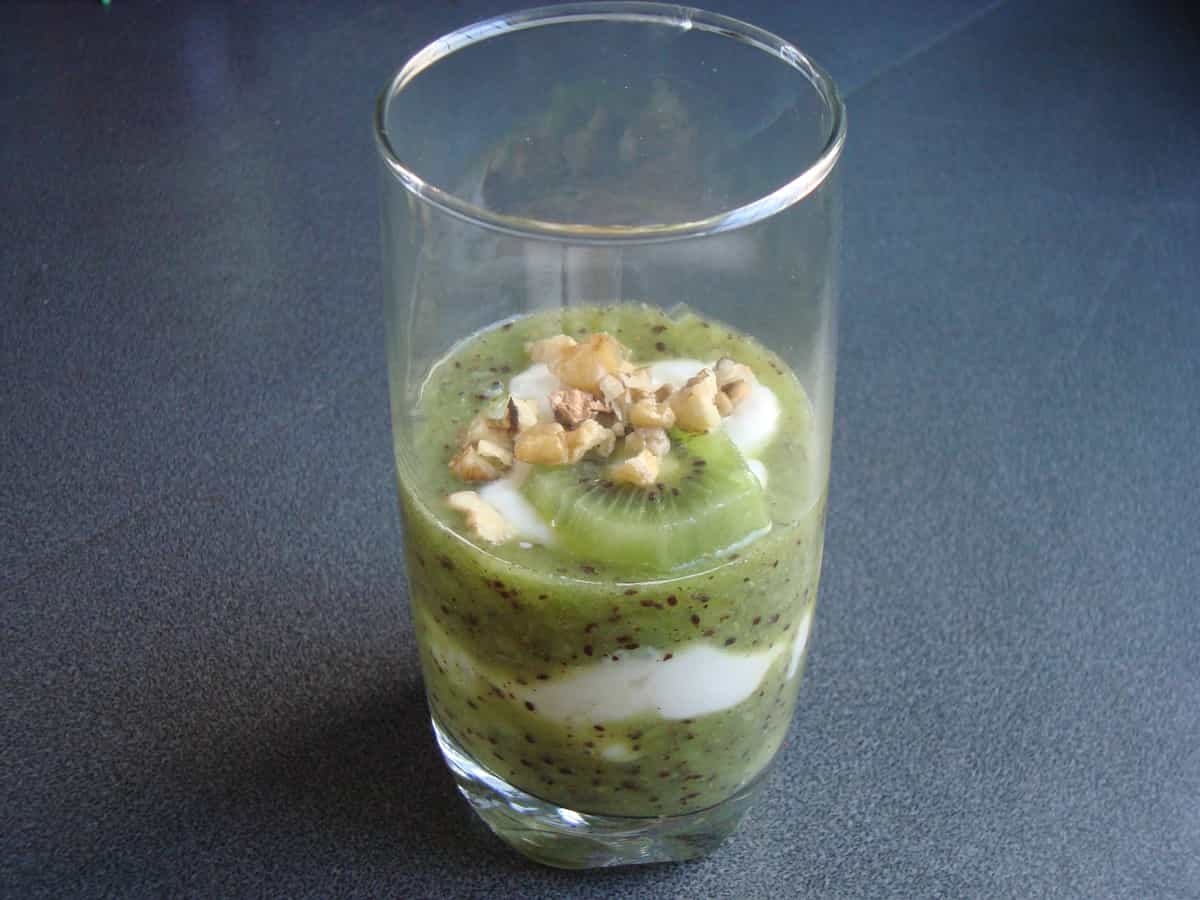 Está comprobado que el kiwi es una fruta cuyo consumo es muy beneficioso para el cuerpo humano, ya que contiene importantes nutrientes y cualidades. Para disfrutarlo al máximo, te invitamos a conocer los fools, deliciosos postres hechos en base a un puré de fruta fresca y crema. En esta ocasión, proponemos una variante a la receta tradicional: fool de kiwi, elaborado con un puré de kiwis frescos, miel y yogurt con frutos secos, el cual se sirve en un vaso. Este postre destaca por ser sano, por su frescura y una linda presentación. ¡Una maravilla natural!