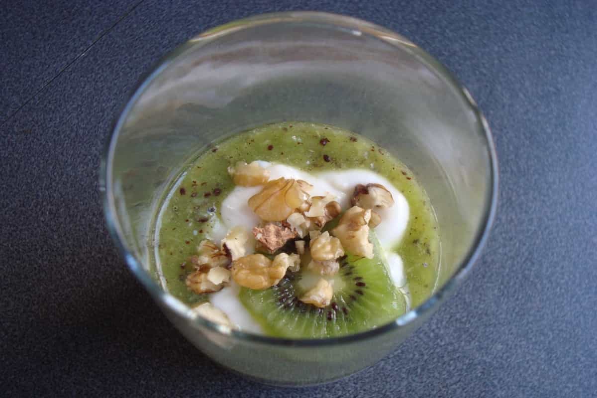 Colocar sobre el yogurt una rodaja de kiwi y espolvorear con nueces picadas. Refrigerar hasta el momento de servir.