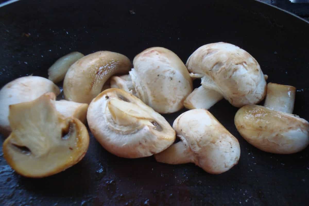 Limpiar los champiñones, colocarlos en un colador y bañarlos en agua hirviendo (debe escurrir). En un sartén con una cucharada de mantequilla derretida, saltear los champiñones partidos por la mitad con jugo de limón y vino blanco. Sazonar a gusto y cocinar hasta que el vino se haya evaporado. Retirar del sartén y reservar.