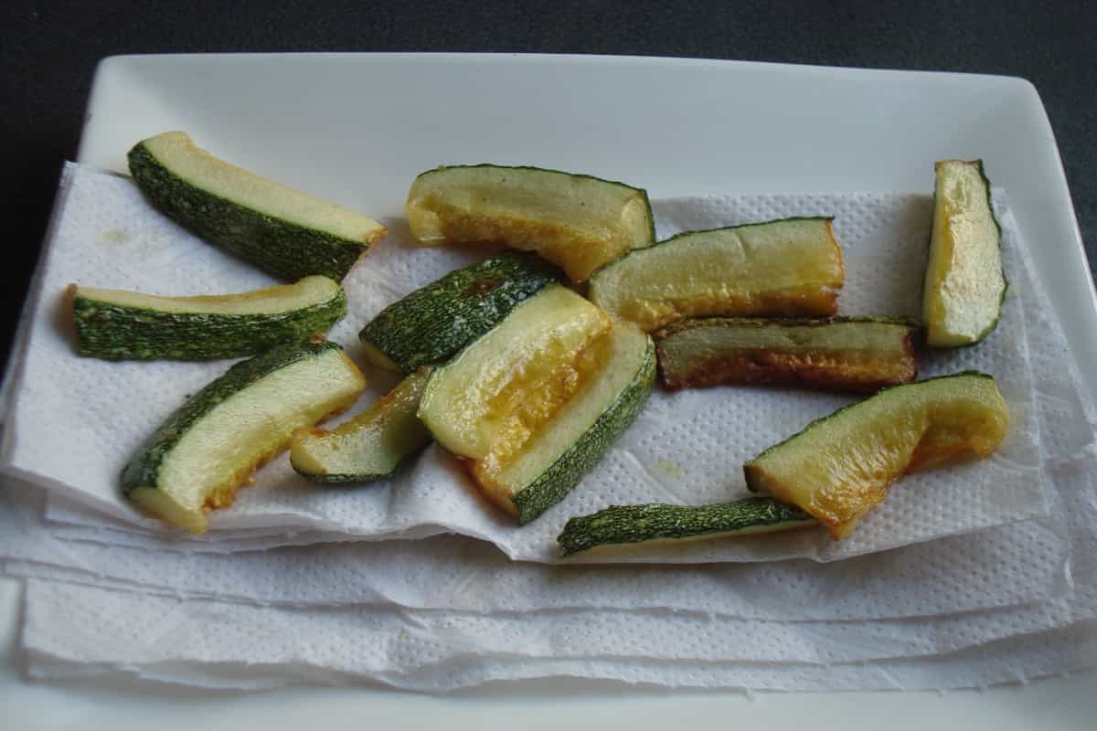 Eliminar los extremos de los zucchinis, cortándolos en cuatro partes cada uno. Cada cuarto, cortarlo a su vez en cuatro partes, para formar bastones. Salpimentar a gusto y freír en aceite caliente hasta que estén dorados. Traspasar a un plato con papel absorbente para eliminar el exceso de aceite. Reservar.