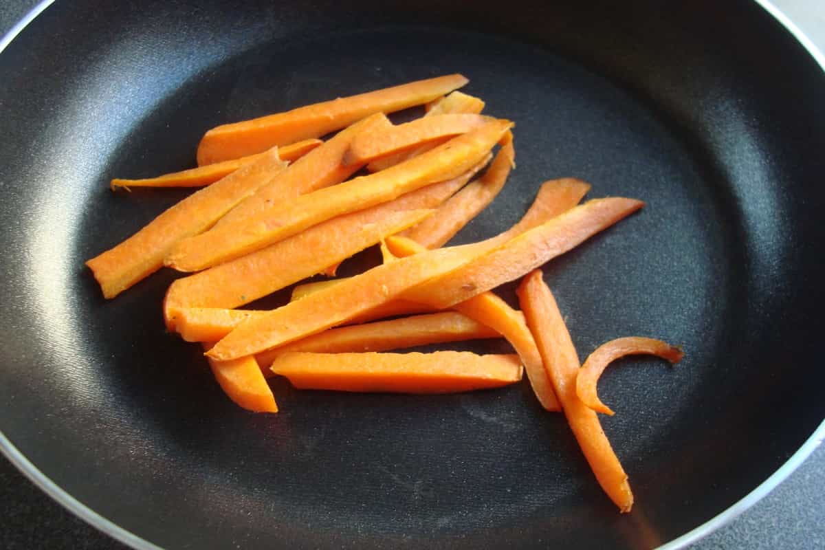 Pelar las zanahorias y cortarlas en bastones, cocinándolas en agua hasta que estén al dente. Escurrir, sazonar a gusto y asarlas por 3 minutos en un sartén o plancha sin aceite.