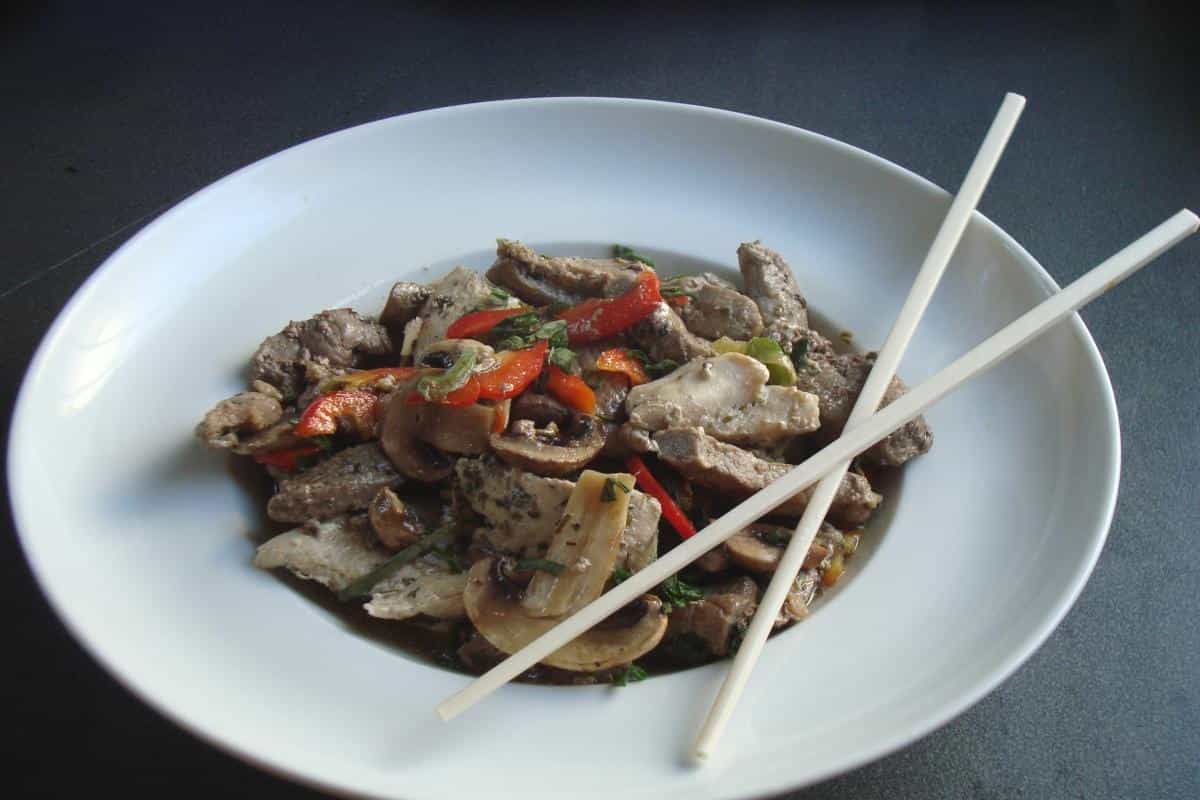 Traspasar la carne, las verduras y las algas chinas a un sartén caliente. Agregar el jugo de la marinada y cocinar a fuego alto por 10 minutos. La carne debe quedar semicocida.