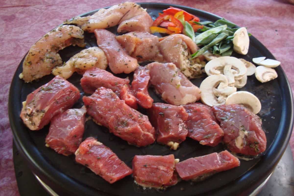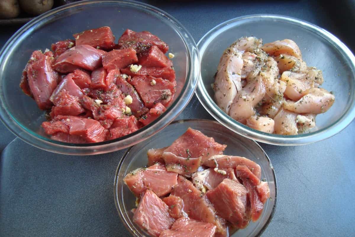 Limpiar las carnes eliminando la grasa, cortarlas en lonjas y colocarlas en 3 pocillos. Distribuir el líquido de la marinada entre los 3 pocillos, incorporar un ajo picado a cada uno, sal, pimienta, orégano y ajinomoto a gusto. Refrigerar la carne por 1 hora.
