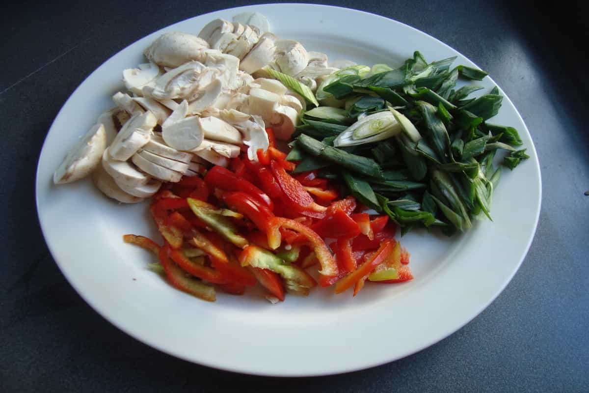 Lavar las verduras, picar los pimentones en tiras, los champiñones laminarlos y los cebollines cortarlos en diagonal.