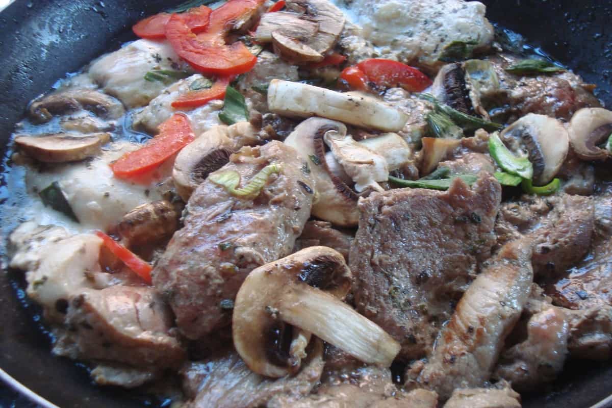 En un grill o plancha caliente (puede ser un sartén de teflón) sellar la carne por todos lados. Reservar el jugo de la marinada. En el mismo grill, saltear las verduras.