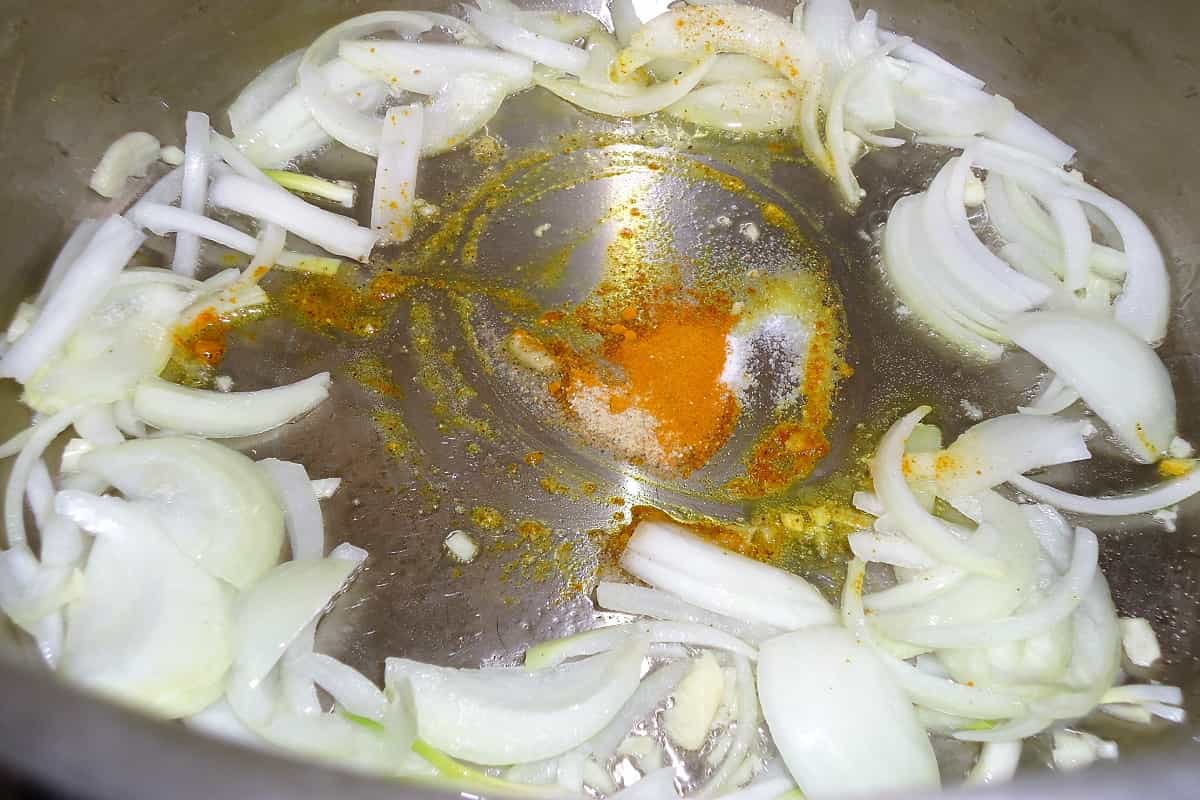 En una olla, calienta el aceite y fríe la cebolla cortada en pluma. Luego agrega el ajo picado, sal, pimienta y el ají de color.