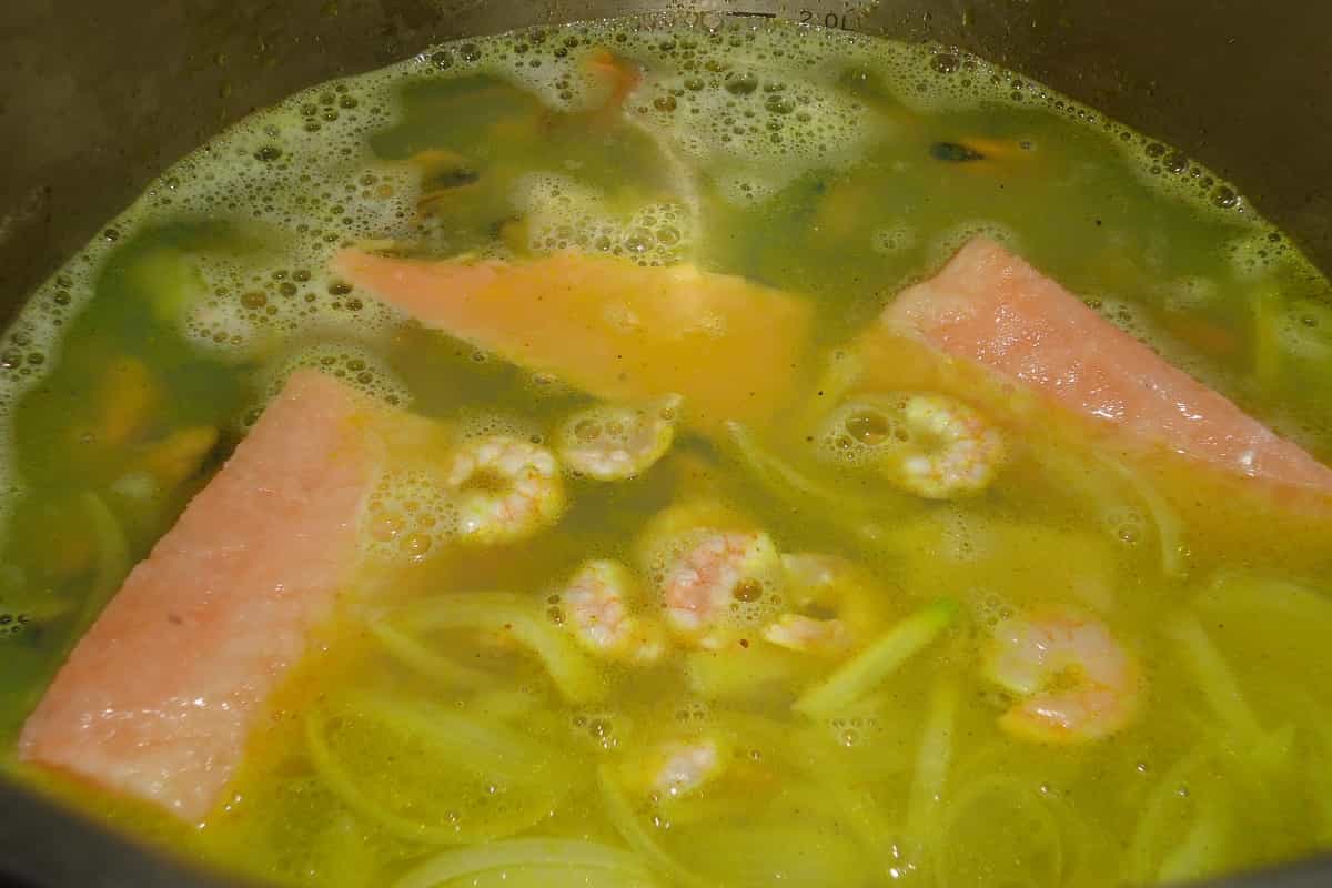 Agrega el vino y el caldo que reservamos de los choritos. Espera que hierva e incorpora los camarones, el surtido de mariscos y los trozos de pescado. Cocina a fuego lento por 15 minutos o hasta que el pescado esté cocido.