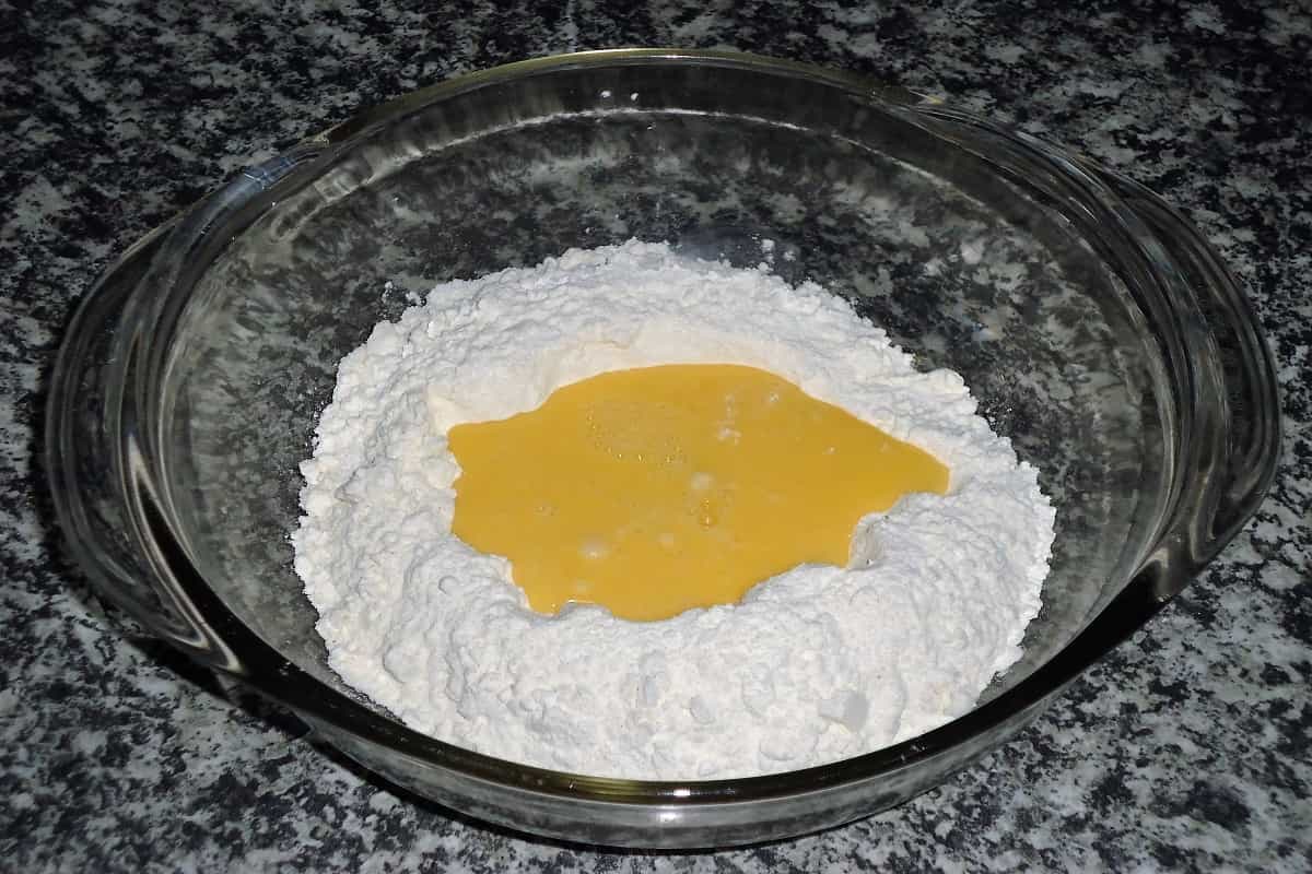 En un recipiente hondo pon la harina y con tus dedos deja un espacio en el centro. En otro recipiente bate un huevo y agrégalo al recipiente con la harina. Agrega el agua tibia y mezcla hasta obtener una masa suave.