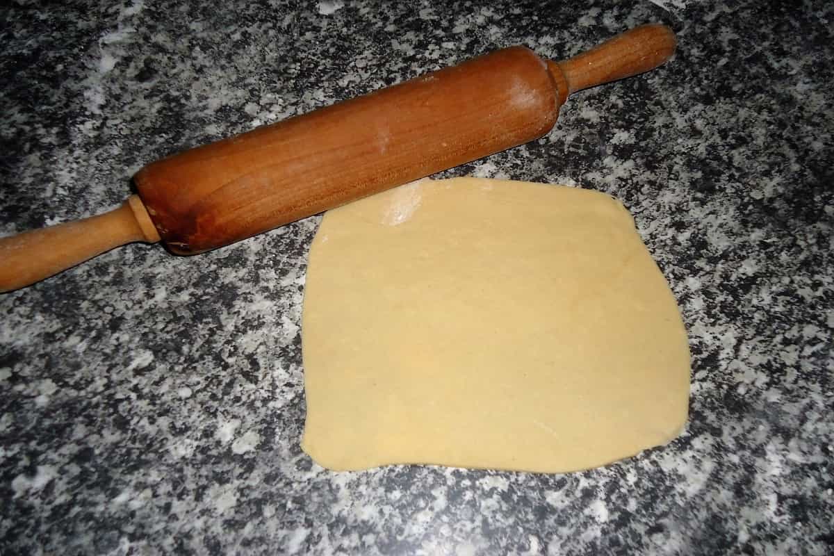 Cuando se haya cumplido el tiempo de la masa en el refrigerador, retírala y sepárala en porciones pequeñas. Uslerea hasta formar una masa delgada de aproximadamente 10x10 centímetros.