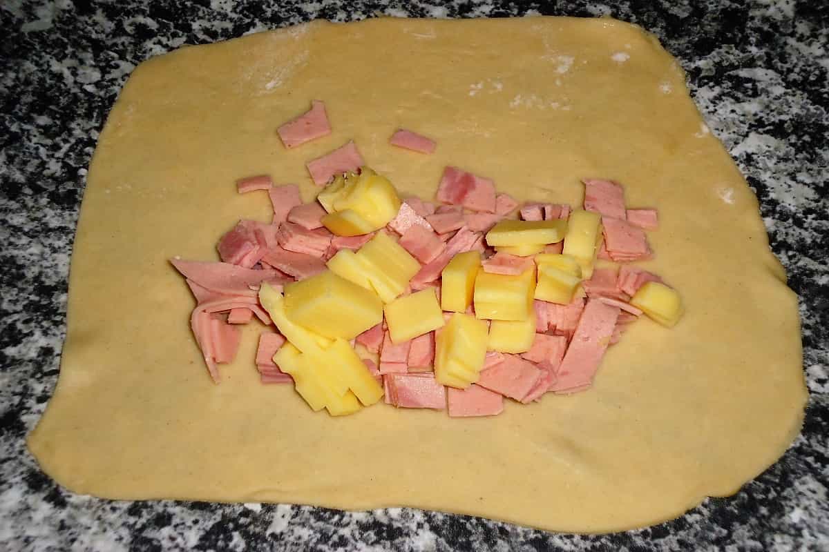 En cada porción de masa, pon un puñado de jamonada y de queso. Luego forma los arrollados. Ten cuidado con los bordes; debes dejarlos cerrados para evitar que el relleno se derrame.
