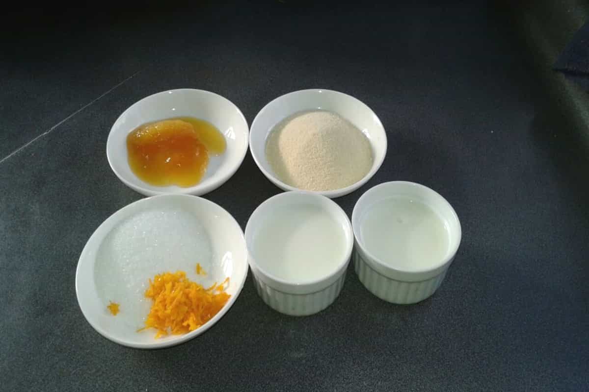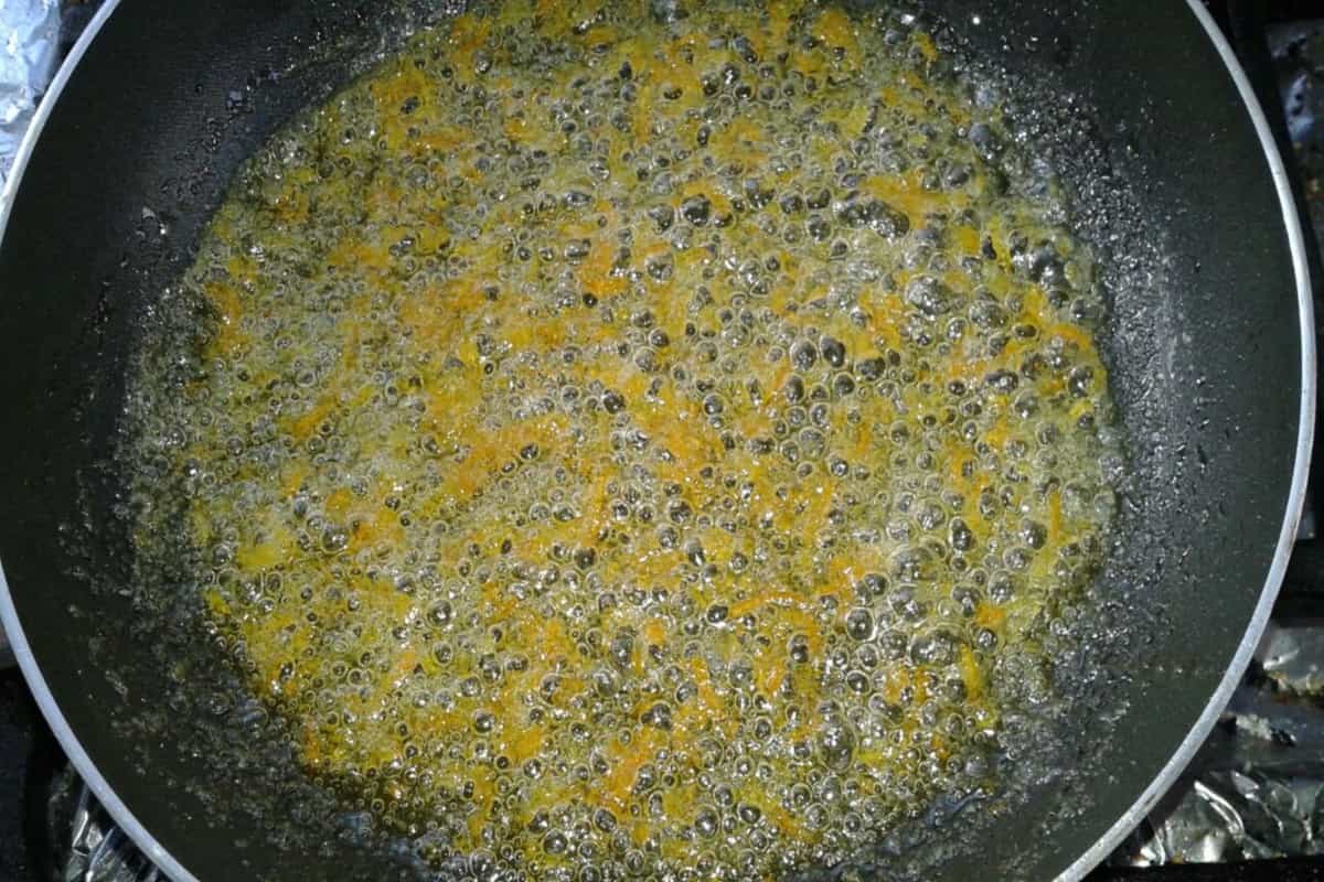 Preparar un caramelo de naranja: en una olla o sartén pequeño, mezclar 1 taza de azúcar, ¼ taza de agua y 2 cucharadas de ralladura de naranja. Cocinar a fuego bajo sin revolver; cuando comience a tomar un color dorado, ir moviéndolo hasta derretir todo el azúcar. Apagar y distribuir en los pocillos, dejando enfriar a temperatura ambiente.