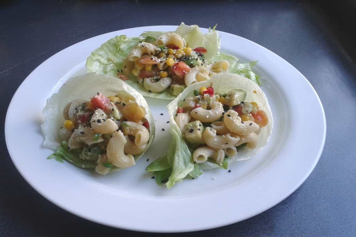 Para armar nuestra ensalada: en una fuente o plato plano disponer las hojas de lechuga. Formar los canastos y rellenarlos con la ensalada de pasta fría. Espolvorear con perejil fresco picado o algunas semillas.
