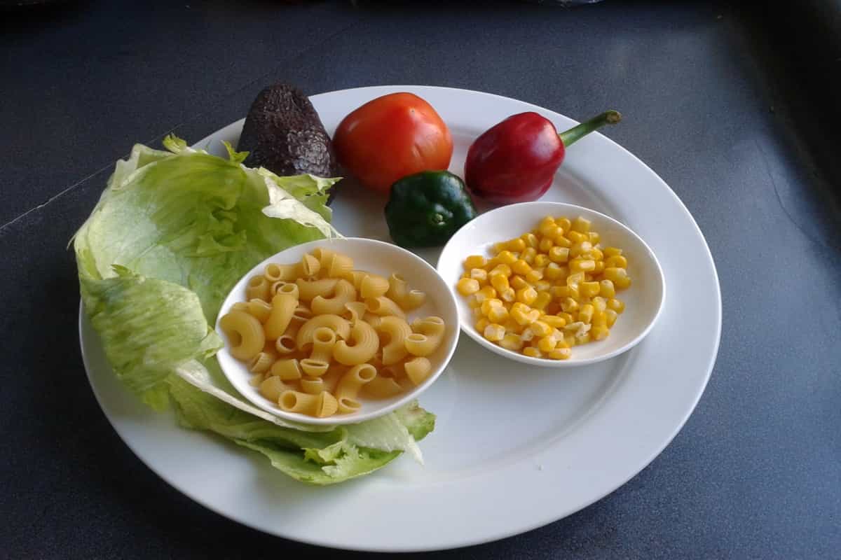 En un pocillo mezclar la pasta cocida y fría, las verduras picadas y el aderezo, revolviendo suavemente.