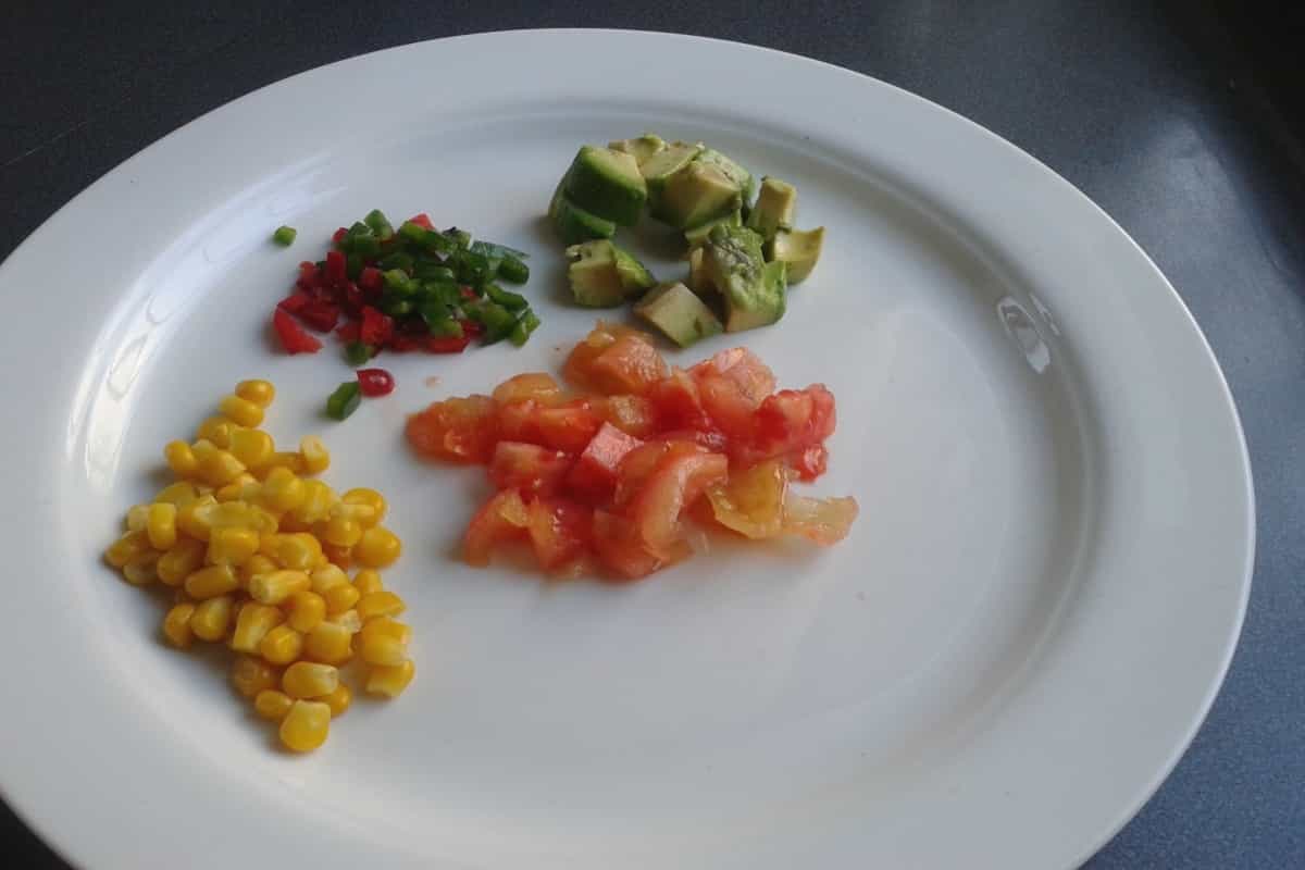 Picar los pimentones en cubos pequeños. Pelar la palta, eliminar el carozo y picarla; pelar los tomates, eliminar las semillas y picarlos. Picar la cebolla y lavarla bien en agua fría por 3 minutos.