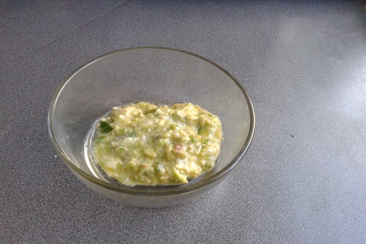 Preparar el aderezo: en un pocillo mezclar ajo picado bien fino, yogurt natural, mostaza, unas gotas de jugo de limón, una cucharada de palta picada, aceite de oliva y sal de mar a gusto.