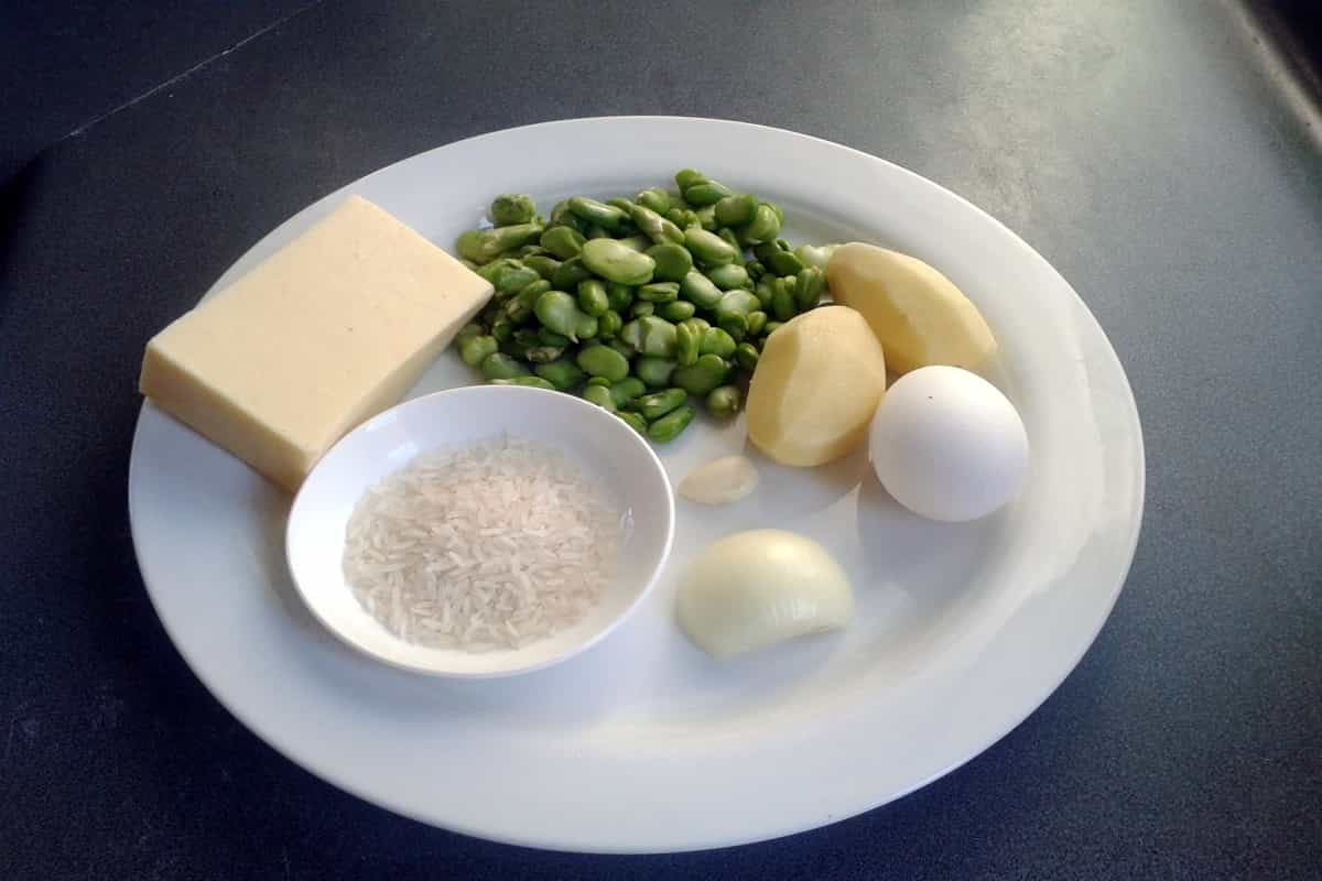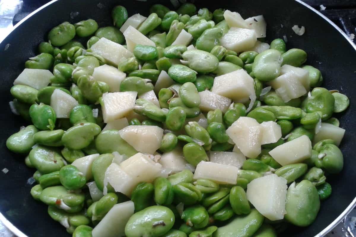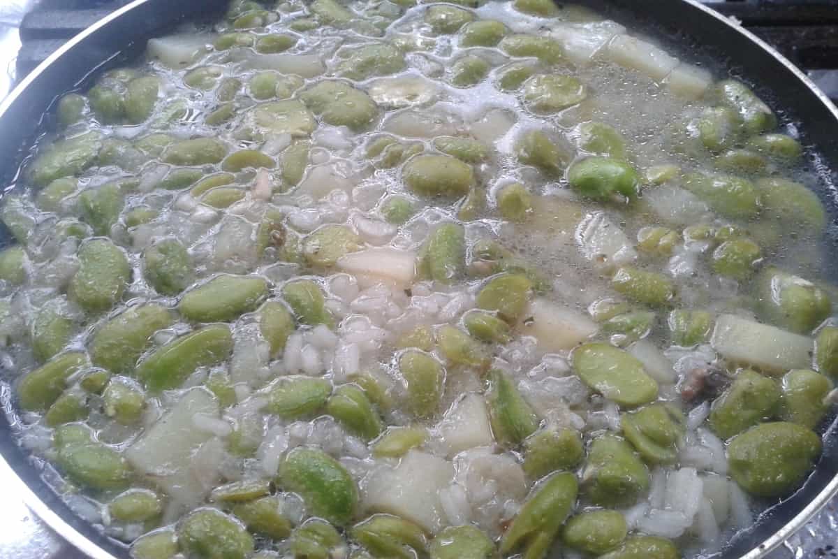 Revolver y añadir 6 tazas de caldo o de agua, salpimentar a gusto y dejar cocinar a fuego medio tapado hasta que las habas y las papas estén al dente y el arroz cocido.