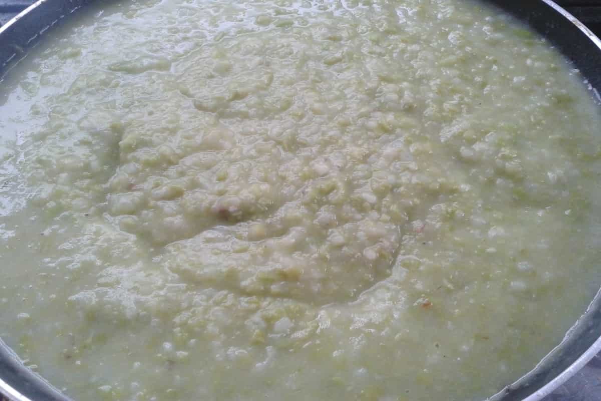 Retirar del fuego y con una procesadora triturar hasta conseguir una especie de crema rústica, ten cuidado de no procesar demasiado para que no quede una textura de puré. Otra opción es verter la preparación en la juguera.