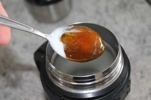 Luego de los diez minutos, cuando la leche está a punto de hervir, la retiramos del fuego y la ponemos en un termo abierto. Cuando la leche esté a unos 46 o 50°, después de media hora aprox, echamos la cucharada de yogurt natural y la cucharada de miel (es un endulzante más sano y nutritivo que el azúcar o similares).
