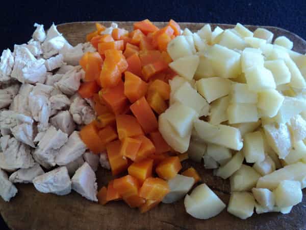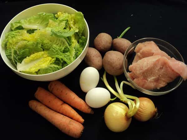 Preparación Lo primero que debes hacer es cocer los filetes de pollo con un poco de sal. En otra olla, coloca los huevos y cocínalos como huevos duros (unos 15 minutos a llama alta). En otra olla, coloca las zanahorias y papas con cáscara a cocer durante unos 25 minutos. Lo más probable es que las papas terminen antes que la zanahoria, así que debes pinchar con un cuchillo para saber si están cocidas. Si a los 25 minutos llegasen a estar listas las papas y no las zanahorias, retírales de la cocción y deja a las zanahorias un rato más, hasta que pinchándolas con el cuchillo se sientan blandas. Para acelerar la cocción yo suelo partir las papas y las zanahorias por la mitad, así ahorraremos gas y tiempo. Mientras se cocinan los demás alimentos, lava y pica la lechuga. Pica el ciboulette y luego la cebolla en cubitos. Cuando las verduras estén listas, retíralas y comienza a sacarle la piel con un cuchillo. Ayúdate con agua helada para que no te quemes. Cuando termines, pícalas en cubitos al igual que el pollo. A los huevos sácales la cáscara y pártelos por la mitad.
