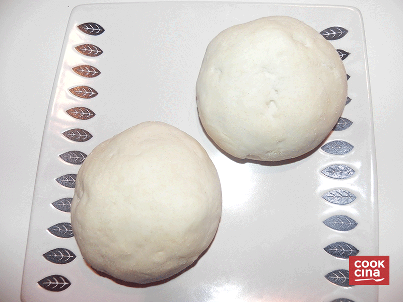 Después de amasar, debes armar 2 bollos con la masa. El truco para que no se peguen: Coloca harina mezclada con sémola en una tabla (o mesa) y con ello comienza a armar 2 bollos. El resultado debiera ser así: