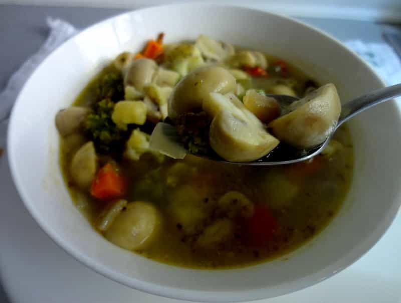 Preparación Corta la cebolla, pimentones y zanahoria en cubos ponlas en una cacerola con aceite de oliva y sofríelos por algunos minutos. Al mismo tiempo continúa cortando el brócoli, la coliflor, el zapallo italiano y agrégalos a la olla y continúa revolviendo todos estos ingredientes. Corta los champiñones por la mitad y agrégalos a la cacerola. Este es el último ingrediente que se agrega al sofrito ya que se cocinan muy rápidamente. Revuelve los ingredientes y agrega agua hirviendo. Deja todos los vegetales cocinar durante unos 15 minutos. Luego agrégale la sal y los aliños que prefieras (comino, pimienta) y tu liviana sopa de vegetales y champiñones estará lista para ser disfrutada.