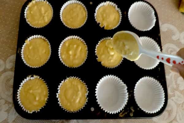 3. Ahora, sólo te queda colocar los capacillos sobre cada orificio del molde y comenzar a rellenar. Ayúdate con una cuchara grande. Llénalos hasta arriba (la idea es que después suba la masa y se formen los quequitos). Finalmente, pon el molde al horno durante 20 minutos.