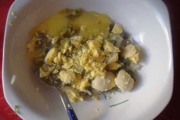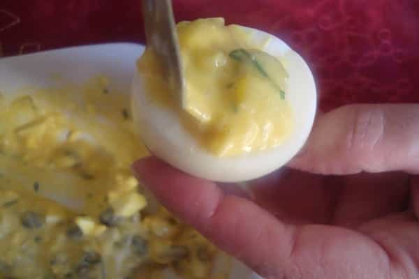 Rellenar con una cucharita los huevos con la mezcla preparada.
