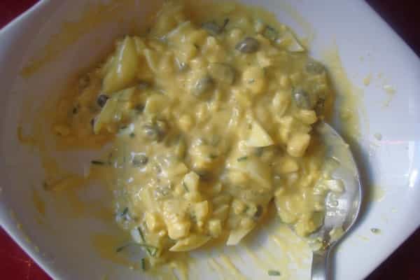 En un recipiente mezclar la mayonesa, las yemas, los pepinillos cortados, las alcaparras, la mostaza, la cebolla, el ciboulette y ajo, sazonar a gusto, refrigerar por una hora antes de ocupar.