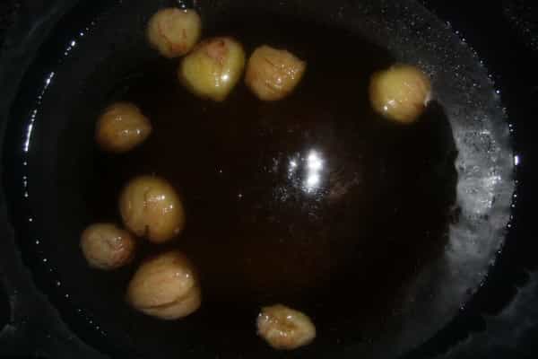 Preparación: Para comenzar, lo primero es pelar nuestras castañas, la mejor forma es sacarle un trozo al medio en la parte de abajo y luego dejarlas hervir por 10 minutos, ya que así la cáscara se desprende de mejor manera, pero hay que hacerlo con mucho cuidado, ya que son muy frágiles y se pueden desarmar y la idea es que estén enteras.