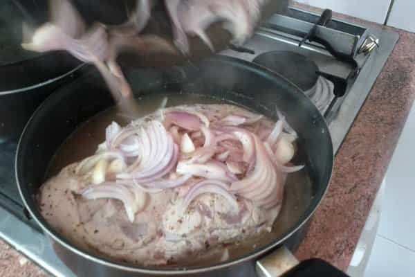 Cortar la cebolla en pluma y el ajo en trozos grandes. En un sartén calentar el aceite de oliva, sofreír la cebolla y el ajo. Retirar el cerdo del marinado de cerveza y sellarlo por todos lados. De esta forma retendrá su sabor y textura. En una olla, poner la cebolla, ajo y cerdo, agregar el marinado de cerveza y aliños. Tapar bien la olla y cocer a 150C por 80 minutos. Si el cerdo no queda totalmente tapado en liquido, deberás ir dándolo vuelta cada 20 minutos.