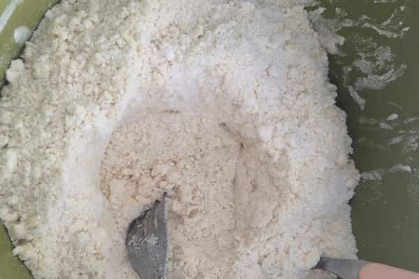 Lo primero que haremos es unir la harina, el azúcar, la manteca y la mantequilla con un tenedor. Es importante que esta parte la hagamos con un tenedor, ya que es lo que le dará a la galleta una consistencia más frágil que se notará al morderla. Este paso es un poco tedioso y lento, pero les aseguro que se notará en el resultado de la galleta.